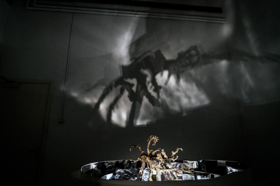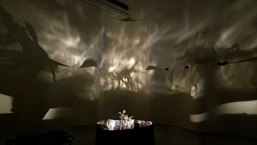 I have worked wirth Ingrid to design and build a rotating shadowmaking machine so the standing sculpture would create a whole room of different moving shadows that take over the space and literally overshadow the small sculpture from which they originate.
