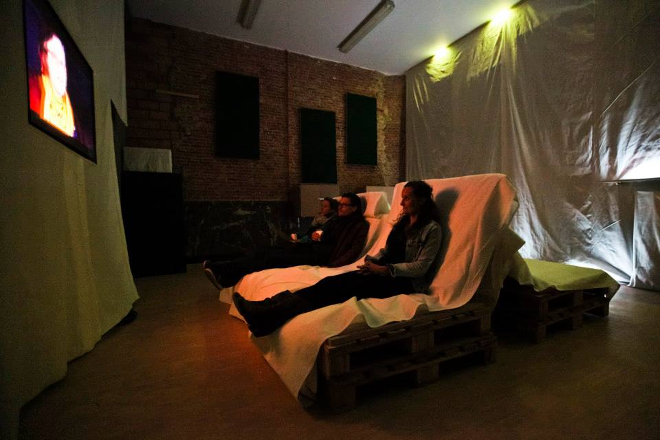 While the people speak about how colour influences their experience of peace, the wall around you change colour by changing lights, so you can feel yourself how colour influences your mood.