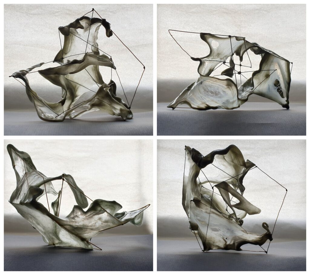 The three-dimensional works are a play between geometric and organic shapes. The starting point for each sculpture is always exactly the same geometric frame, which can be placed in an endless number of different positions. Whenever an interesting position is found, each frame is fixed in place after which it is ‘pulled over’ with exactly the same weight of liquid plastic.