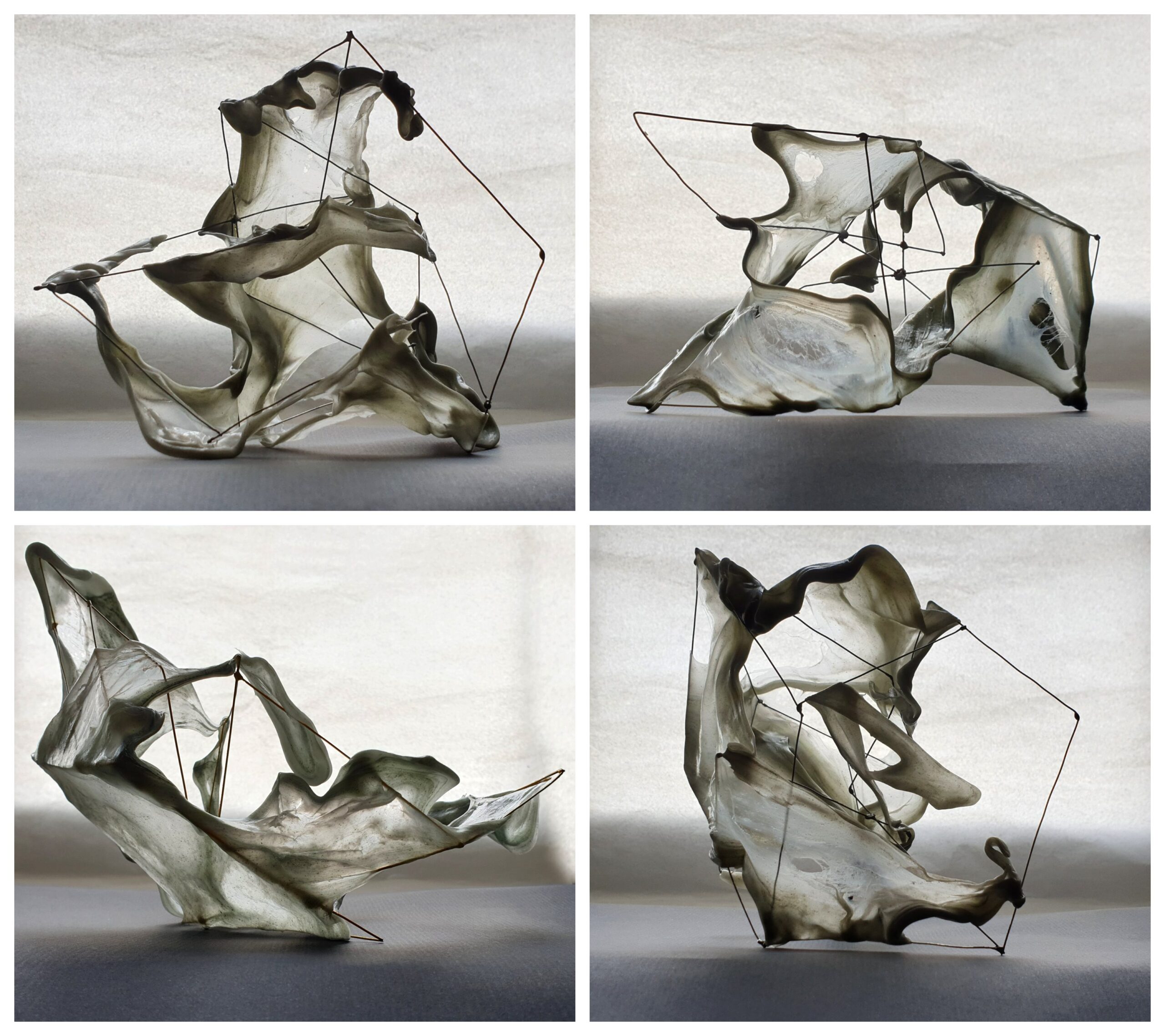 The three-dimensional works are a play between geometric and organic shapes. The starting point for each sculpture is always exactly the same geometric frame, which can be placed in an endless number of different positions. Whenever an interesting position is found, each frame is fixed in place after which it is ‘pulled over’ with exactly the same weight of liquid plastic.