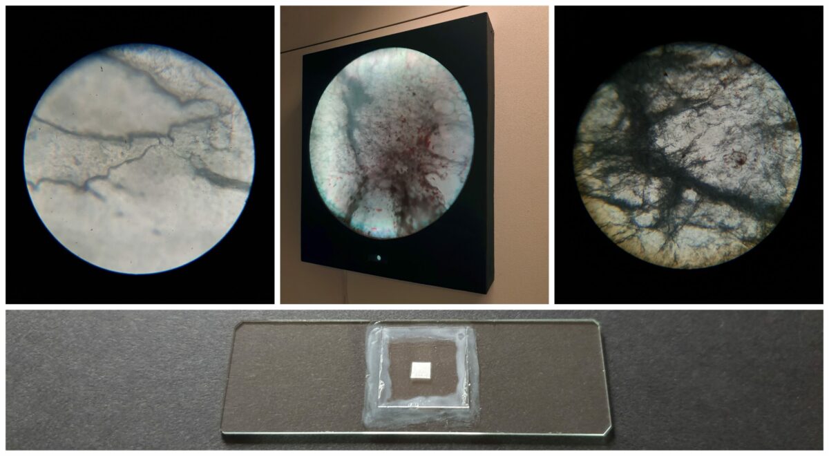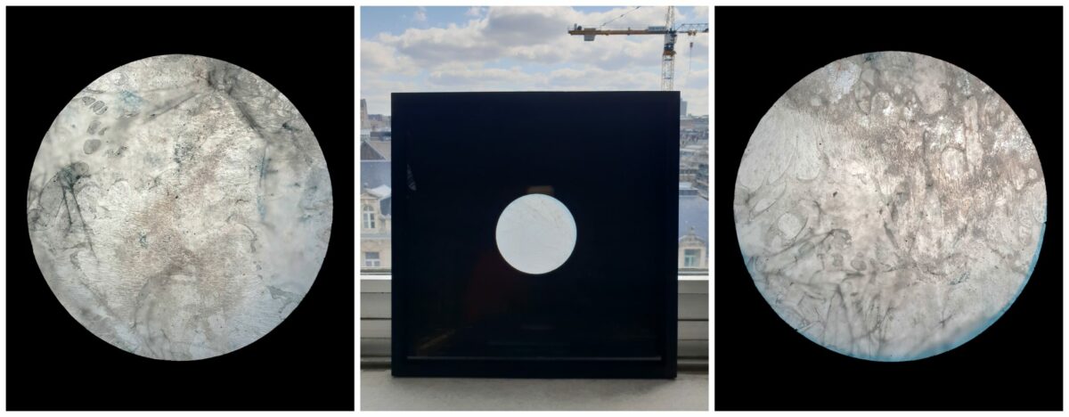 By selecting tiny pieces from the remains of the first works and photographing or filming them under the microscope, I show how much information and beauty can be hidden in something very small that initially seemed insignificant. The photos are printed in a large size on tracing paper to emphasize the difference in scale. The movies are played in slow motion so that every little movement is magnified in time and focus.